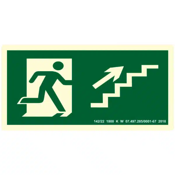 Esta placa de sinalização indicativa de escada do tipo sobe para direita orienta quanto ao sentido da rota de fuga no interior das escadas. Dessa forma, o desenho deve ser posicionado de acordo com o sentido a ser sinalizado.